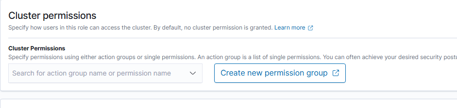Action group | An action group is a group of permissions. For example, the predefined SEARCH action group grants roles permissions to use _search and _msearch APIs. |