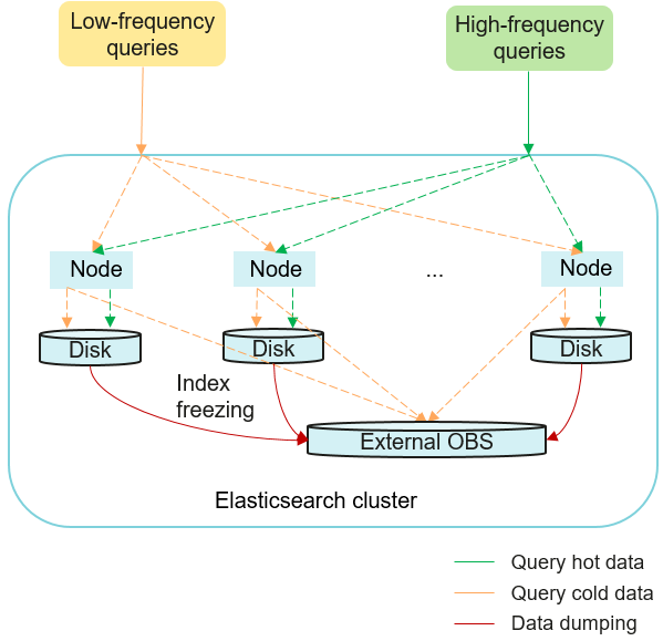 To ensure acceptable performance for cold data queries (for example, when historical data is queried periodically), use a tiered storage solution. For details, see Switching Between Hot and Cold Storage for an Elasticsearch Cluster.