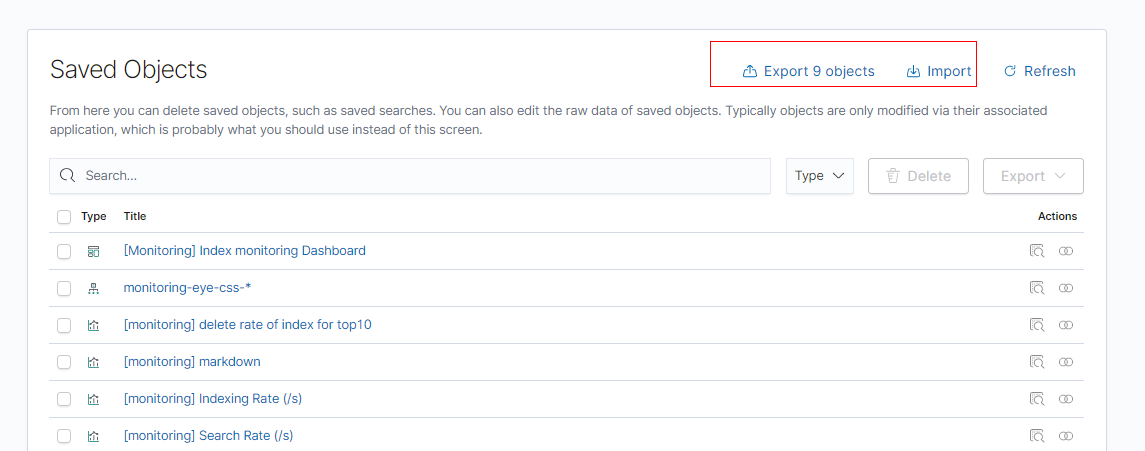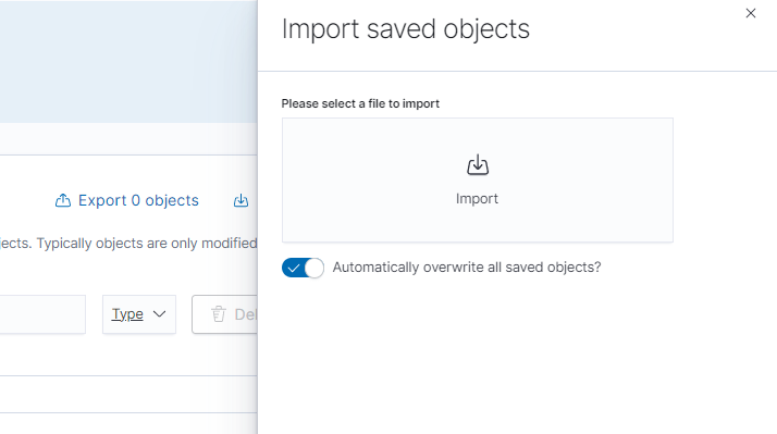 - Click Import and upload the monitoring-kibana.ndjson file created in 1.