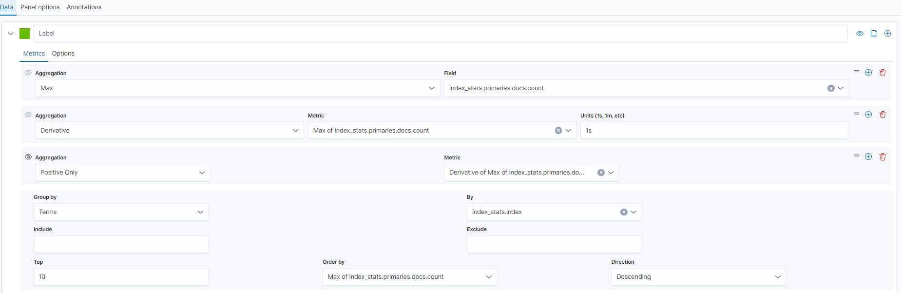 - Select Max for Aggregation, and select index_stats.primaries.docs.count in Field, indicating the number of documents in a primary shard.