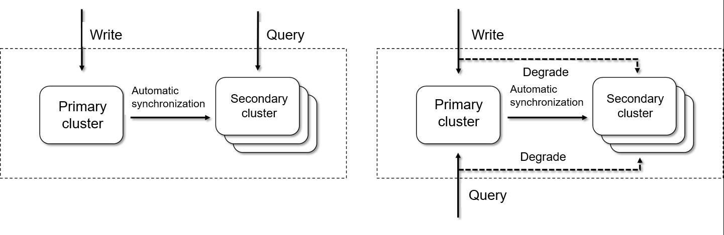 Data written to the primary cluster (Leader) is automatically synchronized to the secondary cluster (Follower). This allows data to be queried from the secondary cluster, improving query performance while alleviating the pressure of the primary cluster. If the primary cluster is unable to provide services, a primary/secondary switchover can be performed to use the secondary cluster to handle write and query requests, ensuring service continuity.