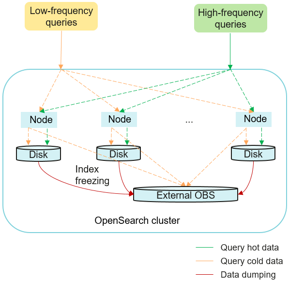 Infrequently accessed data is migrated from SSDs to cost-effective OBS (OBS buckets are invisible to users), turning it from hot data to cold data. You can call the index freezing API to manually turn hot data to cold data, or define a lifecycle policy (for example, a 90-day data retention period) to have it triggered automatically. Cold data itself is stored in OBS for cost efficiency, but its metadata and date fields are maintained on local disks to enable rapid search.