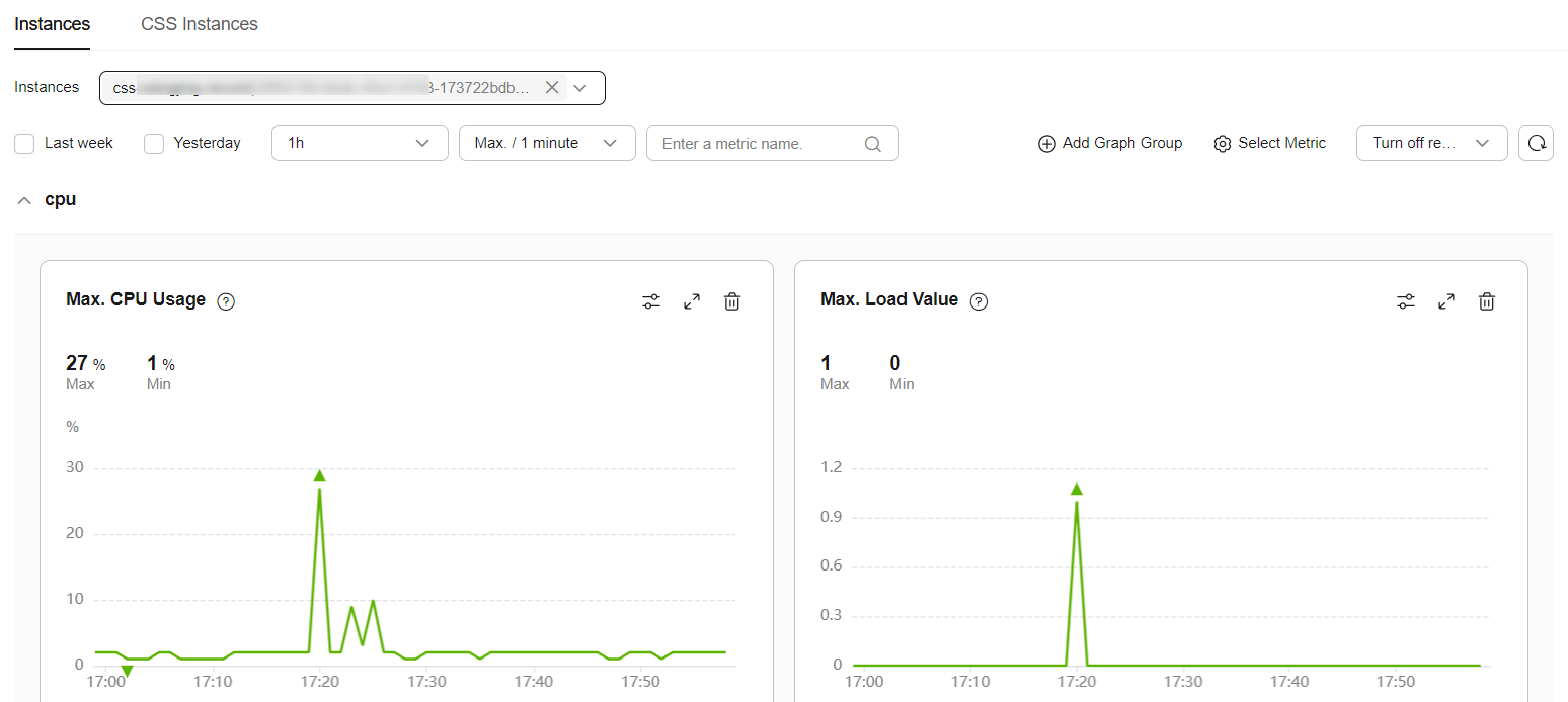 - Click the CSS Instances tab to check the metrics of cluster nodes. Only the node monitoring information of the first cluster selected on the Instances tab is displayed.- CSS Instances: Select the cluster nodes whose metrics and information you want to check. By default, the first node of the current cluster is selected. Multiple nodes can be selected so that you may compare between them.