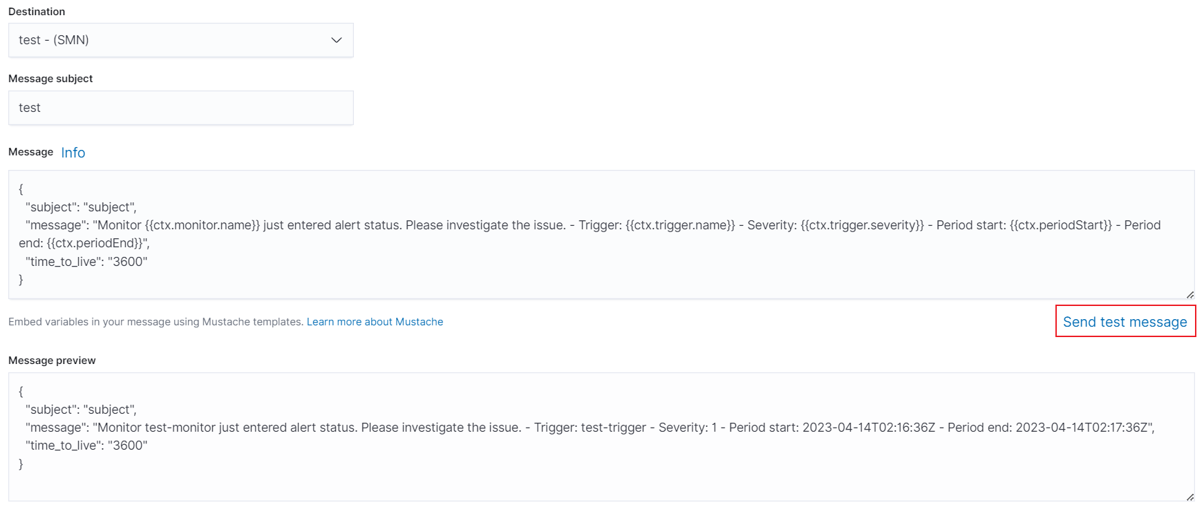 This topic describes how to use the open-source Open Distro alarm plugin to configure alarm alerting via the Simple Message Notification (SMN) service for Elasticsearch clusters in Kibana.