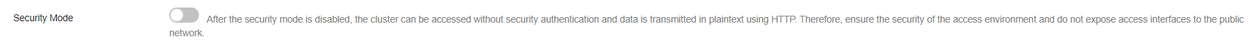 - Clusters with the security mode disabled do not require user authentication, and HTTP is used to transmit data in plaintext. Make sure such a cluster are deployed in a secure environment, and do not expose the cluster's network interface to the public network.