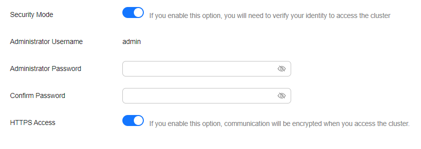 - Enable the security mode. Enter and confirm the administrator password of the cluster.