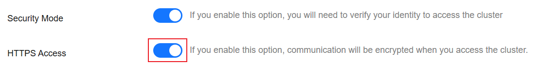 - If you enable HTTPS Access, HTTPS is used to encrypt cluster communication, and public network access can be enabled for the cluster.
