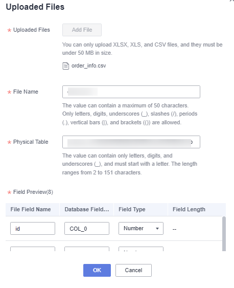 - Click Add File to upload the file and configure file parameters.Figure 2 File parameters  Table 1 Parameters for uploading a file Parameter Description Uploaded Files You can upload XLSX, XLS, and CSV files, and they must be under 50 MB in size. File Name After a file is uploaded, the system automatically identifies the file name. You can also change the file name. NOTE:The file name cannot be empty and can contain a maximum of 50 characters. Only letters, digits, underscores (_), slashes (/), vertical bars (|), and brackets (()) are allowed. Physical Table Name of the table that is automatically created in the database after the file is uploaded to the database. You can change the physical table name. The physical table name can contain a maximum of 150 characters, including letters, digits, and underscores (_). Auto Fill If the database field name is incorrect, click Auto Fill so that the system automatically fills in the default name in the correct format. Field Preview After a file is uploaded to the database, the file is stored in a database table. The database field name and type correspond to the column name and data type in the created database table. The file field name serves as the column header in the uploaded file and is used as the column description in the database table. You can change the file field name, database field name, and field type when uploading a file. File Field Name Name of a field automatically identified by DataArts Insight. This parameter cannot be empty. A field name can contain a maximum of 50 characters, including letters, digits, underscores (_), slashes (/), vertical bars (|), and brackets. Database Field Name Database field name, which cannot be empty. The name can contain only letters, digits, and underscores (_), and cannot exceed 50 characters. Field Type Field type, including text, number, and date. The field type is automatically identified after a file is uploaded. Field Length The value cannot be empty and must be a valid integer containing a maximum of 1000 characters.
