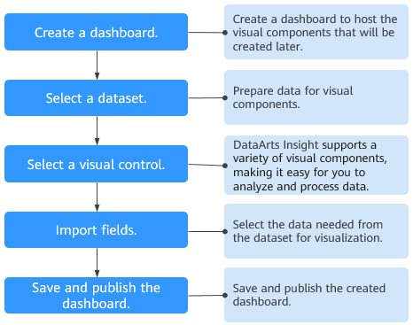 The process of creating a dashboard involves selecting a dataset, choosing visual controls, importing fields, and finally saving and publishing the dashboard. For details, see Creating a Dashboard.