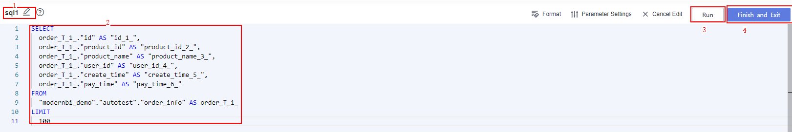 - To associate a data table with a table generated through SQL code, do as follows:- Drag a table and click Edit SQL Statement. On the SQL editing page that is displayed, edit SQL statements.