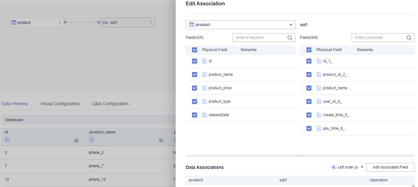 - Configure associated fields.When configuring data association, make sure the associated fields are those selected from the associated data table.