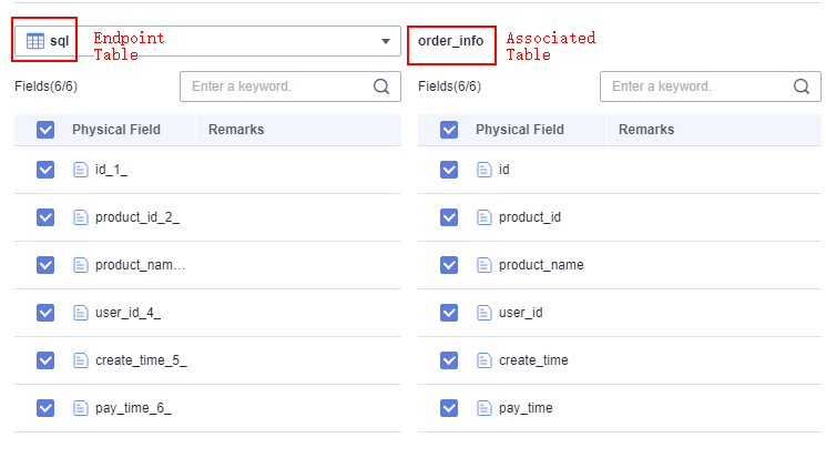 - Edit the table association relationship.- If the data model to be analyzed is complex and multiple tables need to be associated, use an association relationship to select the endpoint table.Figure 4 Selecting an endpoint table