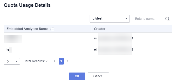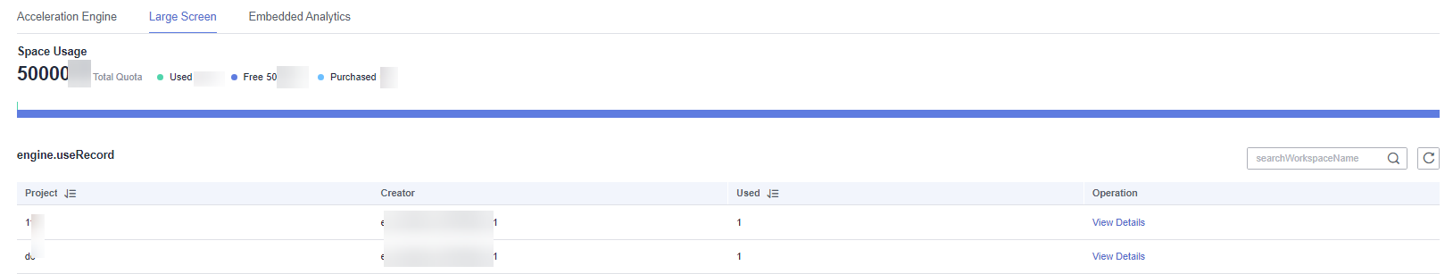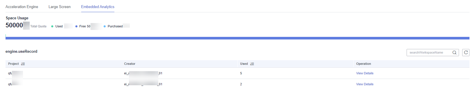 - To view the quota usage details of the embedded analytics, you can click View Details in the Operation column of the selected project. The Quota Usage Details page is displayed.