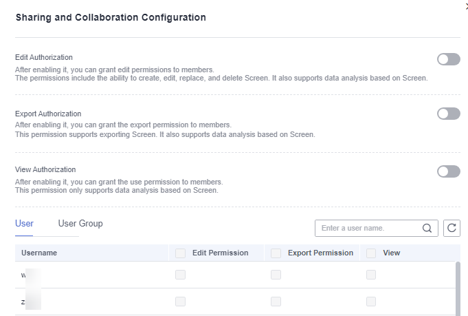- Edit Authorization: Enabling this allows you to grant edit permissions to members, including creating, editing, replacing, and deleting the screen, as well as performing data analysis based on the screen.