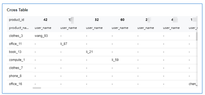 A cross table displays summary values of a field in a table and merges similar data. One group of columns is displayed on the left side of the table, while the other group is displayed at the top. The intersection of rows and columns can be used to calculate summary values by adding them up. This section will show you how to add data and configure styles for a cross table.