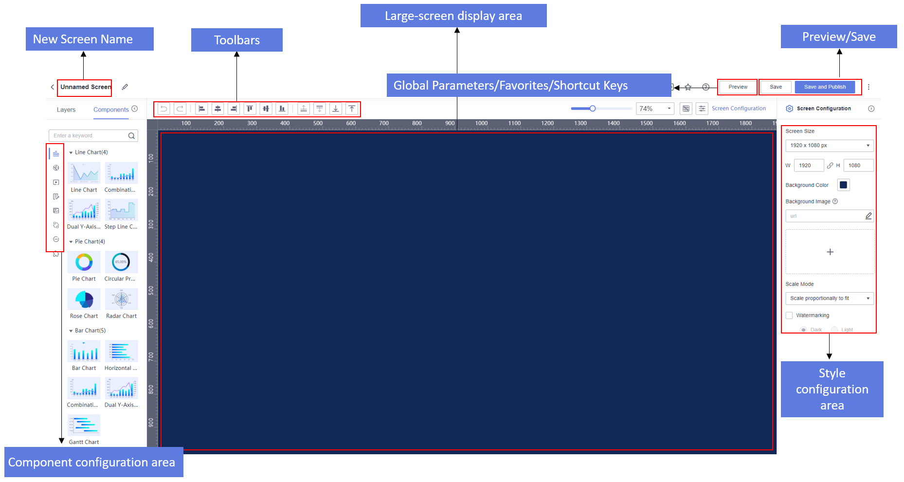 - Save: After a large screen is saved, you cannot view it on the page.