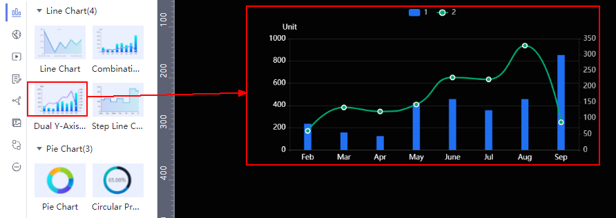 - In the left pane, drag required components to the canvas. You can also click to add components. In this example, we will use a dual Y-axis combination chart to demonstrate how to create and configure large screen components.
