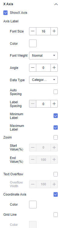 ), the X axis is not displayed. - Axis Label: You can set the font size, color, font weight, and angle.