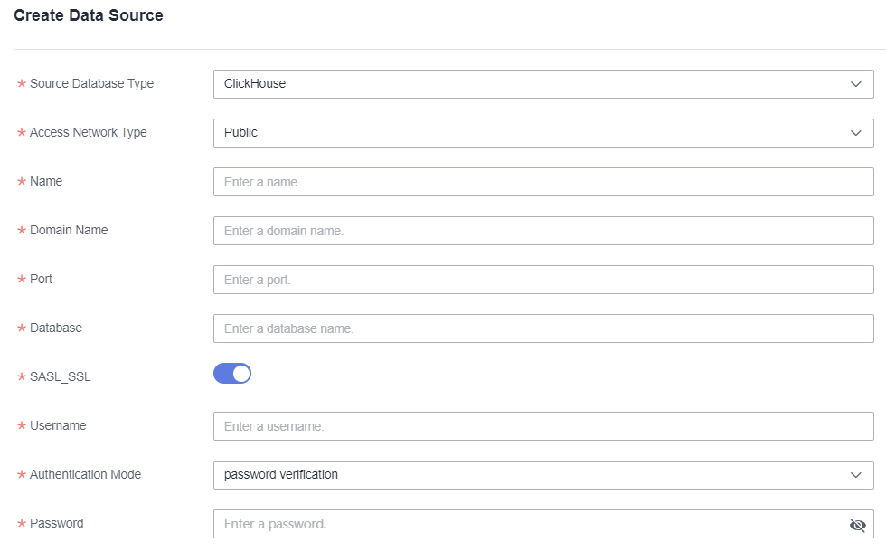 - In the navigation pane on the left, choose Data Management > Data Sources. On the displayed page, click Create Data Source. In the slide-out panel, set Source Database Type to ClickHouse and Access Network Type to Public network.