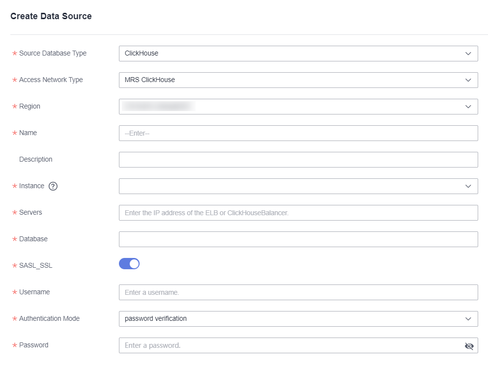 - In the navigation pane on the left, choose Data Management > Data Sources. On the displayed page, click Create Data Source. In the slide-out panel, set Source Database Type to ClickHouse and Access Network Type to MRS ClickHouse.