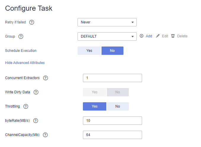 If you select Yes, you can set the start time, cycle, and validity period of a job. For details, see Configuring a Scheduled CDM Job.