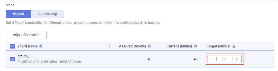 - Manual- Set target bandwidth. For cluster instances with multiple shards, specify the target for each of them, or select the desired shards and click Adjust Bandwidth.Figure 2 Manually setting target bandwidth