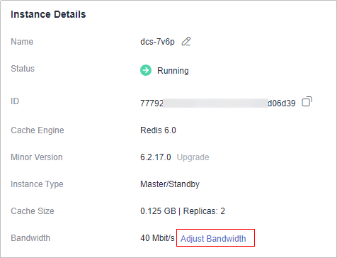 - In the Instance Details area of the DCS instance, click Adjust Bandwidth next to Bandwidth.Figure 1 Adjusting bandwidth