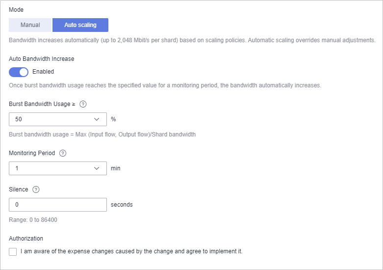 - Auto scaling- Enable Auto Bandwidth Increase and set the policies as required, as shown in Table 1.Bandwidth increases automatically (up to 2,048 Mbit/s per shard) based on scaling policies. Automatic scaling overrides manual adjustments. Figure 3 Setting auto bandwidth increase policies  Table 1 Setting auto bandwidth increase policies Policy Description Burst Bandwidth Usage ≥ Burst bandwidth usage threshold for bandwidth increases. Calculation: Burst bandwidth usage = Burst used bandwidth/Shard bandwidth. The value of "Burst used bandwidth" uses the larger metric between Output Flow and Input Flow. Target: When the burst bandwidth usage of an instance shard reaches the threshold, the shard bandwidth is automatically scaled up. As a result, the burst bandwidth usage is reduced to (its threshold minus 10%). For example, if this threshold is set to 70%, the shard bandwidth will be automatically increased when the burst bandwidth usage reaches 70%. As a result, the burst bandwidth usage decreases to 60%. Therefore, the shard bandwidth after the scaling equals the burst bandwidth usage divided by 60%. Monitoring Period Monitoring period of bandwidth increases, in minutes. Default: 1 For example, if the monitoring period is set to 1 minute, the bandwidth data is monitored within 1 minute. Silence Interval between increases, in seconds. Default: 0 The silence time avoids consecutive automatic bandwidth increases.