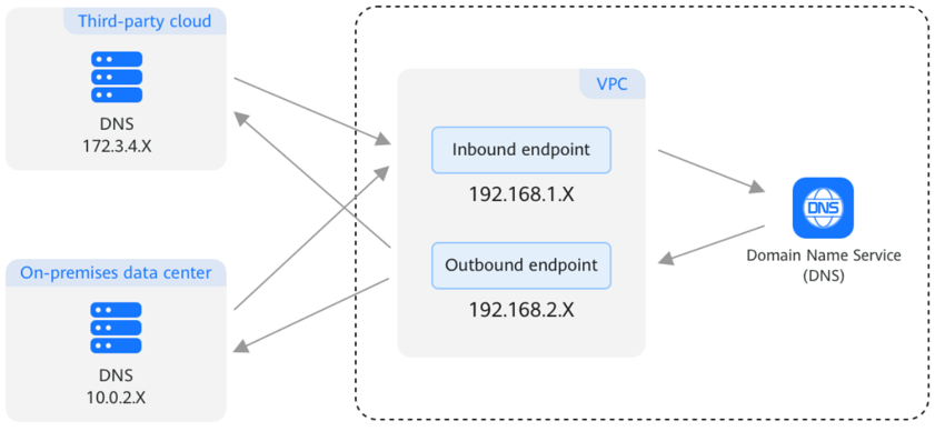 DNS Resolver translates IP addresses starting with 100 to private IP addresses used in VPCs. On-premises resources can directly access the private IP addresses used in VPCs, and they do not need to access IP addresses starting with 100, which greatly simplifies the networking architecture. If a customer uses Direct Connect or VPN to set up a hybrid cloud, they only need to create inbound and outbound endpoints and associate VPCs with these endpoints to resolve DNS queries between the on-premises network and VPCs. If a third-party cloud DNS requires access to a domain name hosted on a cloud, inbound endpoints allow DNS queries to the VPCs from that third-party cloud. Conversely, if a VM on the cloud seeks to access a third-party domain name, an outbound endpoint with rules configured can forward DNS queries to the on-premises network or that third-party cloud. In this way, on-premises and cloud services can easily communicate with each other in hybrid cloud scenarios.