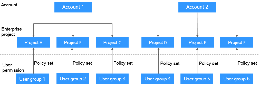 Enterprises can create projects and member accounts based on the organization structure. The resources and networks of the accounts can also be isolated from each other.