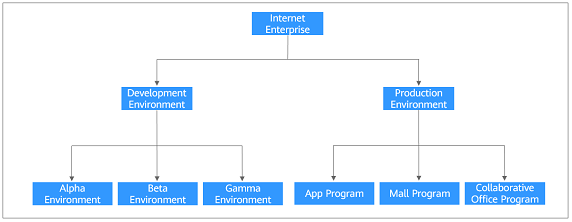 For example, an Internet enterprise needs to deploy the development environment and production environment during software development. The former is used for Alpha, Beta, and Gamma tests, and the latter is used to calculate costs based on programs (such as app program, mall program, and collaborative office program). The enterprise also requires that the two environments be isolated from each other to prevent the development tests from affecting the cost accounting in the production environment. Then two accounts are needed to separate the two environments. For account 1, projects A, B, and C can be created for Alpha, Beta, and Gamma. For account 2, projects D, E, and F can be created for the app program, mall program, and collaborative office program. Set a user group for each enterprise project to manage resources. Figure 3 shows the organization structure of the game company, and Figure 4 shows the solution diagram.