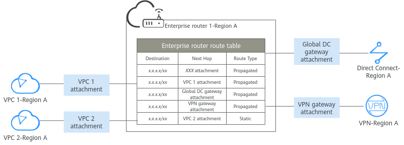 You can create an attachment to attach a network instance to an enterprise router. The attachment type varies by the type of network instance.