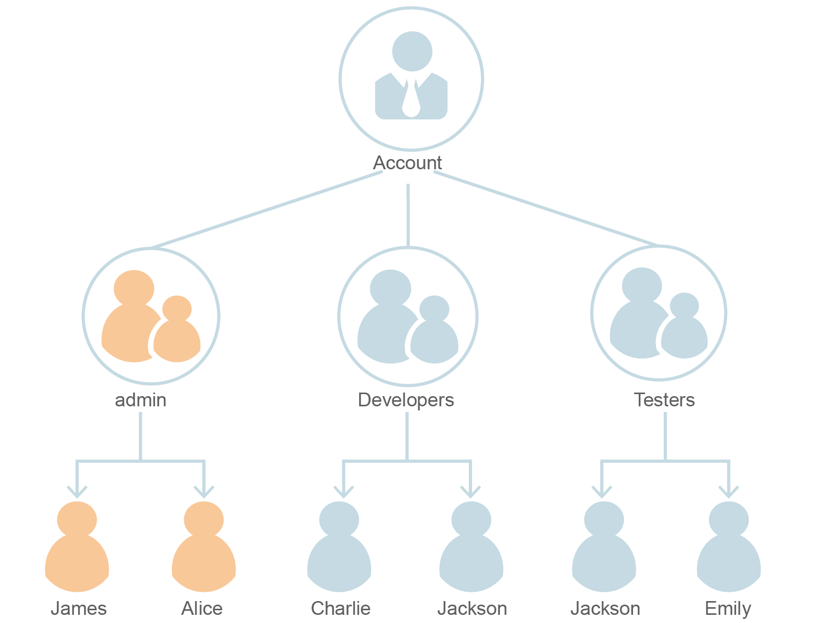 - Test team (Testers group in Figure 1): tests websites. The team members include Jackson and Emily. Jackson develops and tests websites, so he needs to join both the Developers and Testers groups to obtain the required permissions.