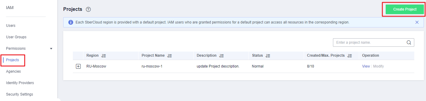 - In the left navigation pane on the IAM console, choose Projects and click Create Project.