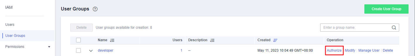 For more information about user group authorization, see Creating a User Group and Assigning Permissions.