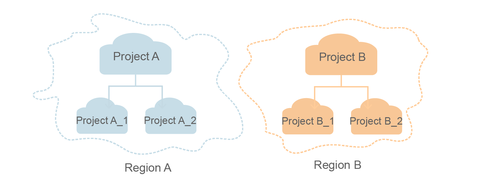 Projects are used to isolate resources (including compute, storage, and network resources) among physical regions. A project is provided for each region by default, and permissions are assigned based on projects.