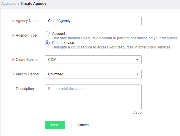 Services on the cloud platform interwork with each other, and some cloud services are dependent on other services. To delegate a cloud service to access other services and perform resource O&M, create an agency for the service.
