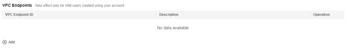 Specify access to the cloud platform APIs only from the VPC Endpoint with the specified ID, for example, 0ccad098-b8f4-495a-9b10-613e2a5exxxx. You can set the VPC endpoint only on the API Access tab. If access control is not configured, you can access APIs from all VPC endpoints by default.