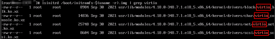 SIA10000xxxxx:~ # lsinitrd /boot/initrd-`uname -r` | grep virtio-rwxr--r-- 1 root root 19248 Jun 22 2012 lib/modules/2.6.32-279.el6.x86_64/kernel/drivers/scsi/virtio_scsi.ko-rwxr--r-- 1 root root 23856 Jun 22 2012 lib/modules/2.6.32-279.el6.x86_64/kernel/drivers/block/virtio_blk.kodrwxr-xr-x 2 root root 0 Jul 12 14:53 lib/modules/2.6.32-279.el6.x86_64/kernel/drivers/virtio-rwxr--r-- 1 root root 15848 Jun 22 2012 lib/modules/2.6.32-279.el6.x86_64/kernel/drivers/virtio/virtio_ring.ko-rwxr--r-- 1 root root 20008 Jun 22 2012 lib/modules/2.6.32-279.el6.x86_64/kernel/drivers/virtio/virtio_pci.ko-rwxr--r-- 1 root root 12272 Jun 22 2012 lib/modules/2.6.32-279.el6.x86_64/kernel/drivers/virtio/virtio.ko-rwxr--r-- 1 root root 38208 Jun 22 2012 lib/modules/2.6.32-279.el6.x86_64/kernel/drivers/net/virtio_net.koNoteIf you add built-in drivers to the initrd or initramfs file, the ECS will not be affected. This makes it easy to modify the drivers. However, you cannot check the drivers by running the lsinitrd command. You can run the following command to check whether the drivers are built-in ones in the kernel: