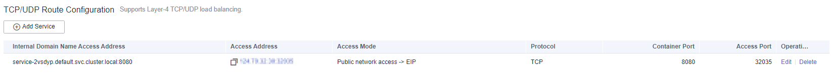 - Click Add Service in the TCP/UDP Route Configuration area and set parameters by referring to the following table.