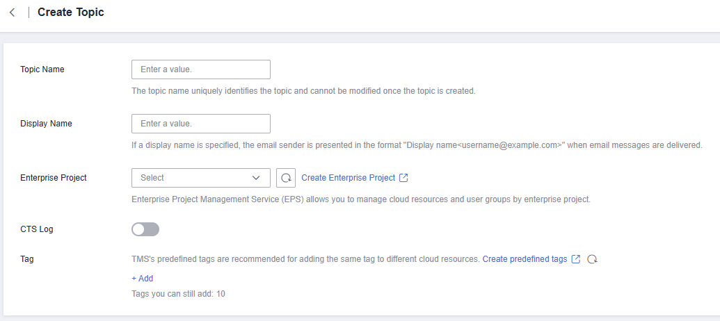 Display Name Message sender name, which can contain up to 192 bytes. NOTE:After you specify a display name, the sender in email messages will be presented as Display name<username@example.com>. Otherwise, the sender will be username@example.com. Enterprise Project Name of an enterprise project. An enterprise project allows you to group cloud resources under specific projects and makes it easier to manage cloud resources and users. This parameter is for enterprise users. CTS Log Whether to enable CTS log. Log Group Select a log group. A log group is a group of log streams which share the same log retention settings. For details, see Log Groups. Log Stream Select a log stream in the specified log group. A log stream is the basic unit for log reads and writes. You can sort logs of different types, such as operation logs and access logs, into different log streams. For details, see Log Streams. Tag A tag is a key-value pair. Tags identify cloud resources so that you can easily categorize and search for your resources. - A key can contain up to 128 characters, and a value can contain up to 255 characters.