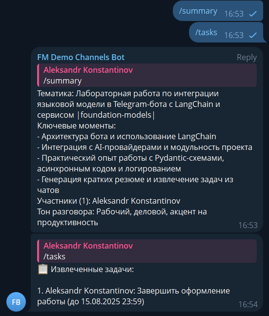 С помощью этого руководства вы познакомитесь с проектом evo-foundation-models-tg-bot-lab — Telegram-ботом, который демонстрирует, как интегрировать языковую модель при помощи фреймворка LangChain и сервиса Foundation Models. Бот автоматически логирует сообщения чатов и выполняет интеллектуальный анализ: составляет краткие изложения диалогов и извлекает из них задачи.