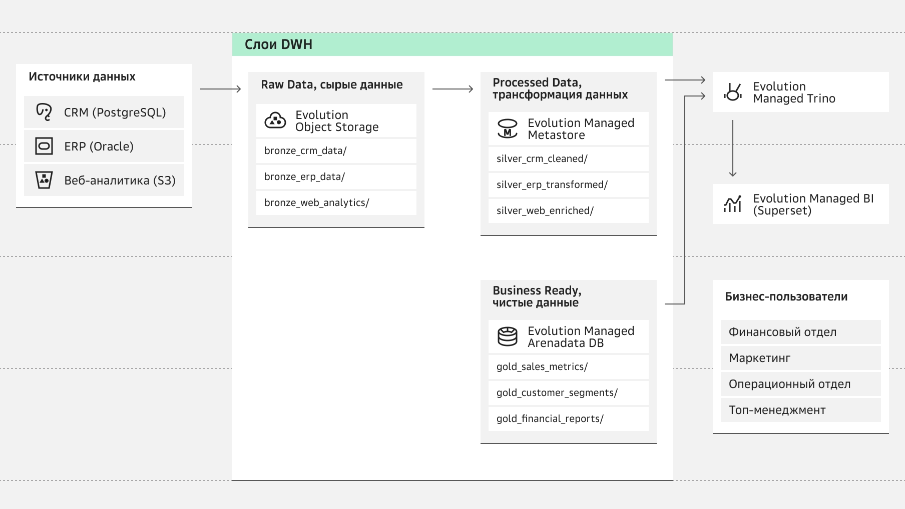 Сервисы работают как единая система: Trino интегрируется с каталогами Metastore, Spark напрямую работает с бакетами хранилища Evolution Object Storage, BI подключается к любому источнику в несколько кликов. Экономьте месяцы на интеграции.